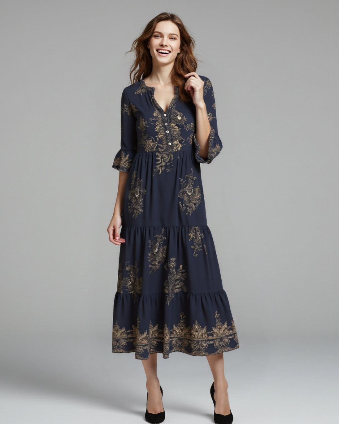 Un design boho-chic care radiază eleganță și prospețime. Imprimeul auriu adaugă o strălucire subtilă, în timp ce decolteul în V flatează silueta. Perfect pentru ocazii speciale sau pentru un look relaxat, dar elegant.